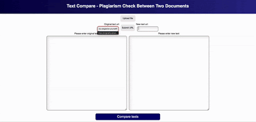 Text comparison is the process of taking two or more pieces of text and comparing them to see if there are any similarities, differences and/or plagiarism. The objective of a text comparison is to see if one of the texts has been copied or paraphrased from another text. This text compare tool for plagiarism check between two documents has been built to help you streamline that process by finding the discrepancies with ease.