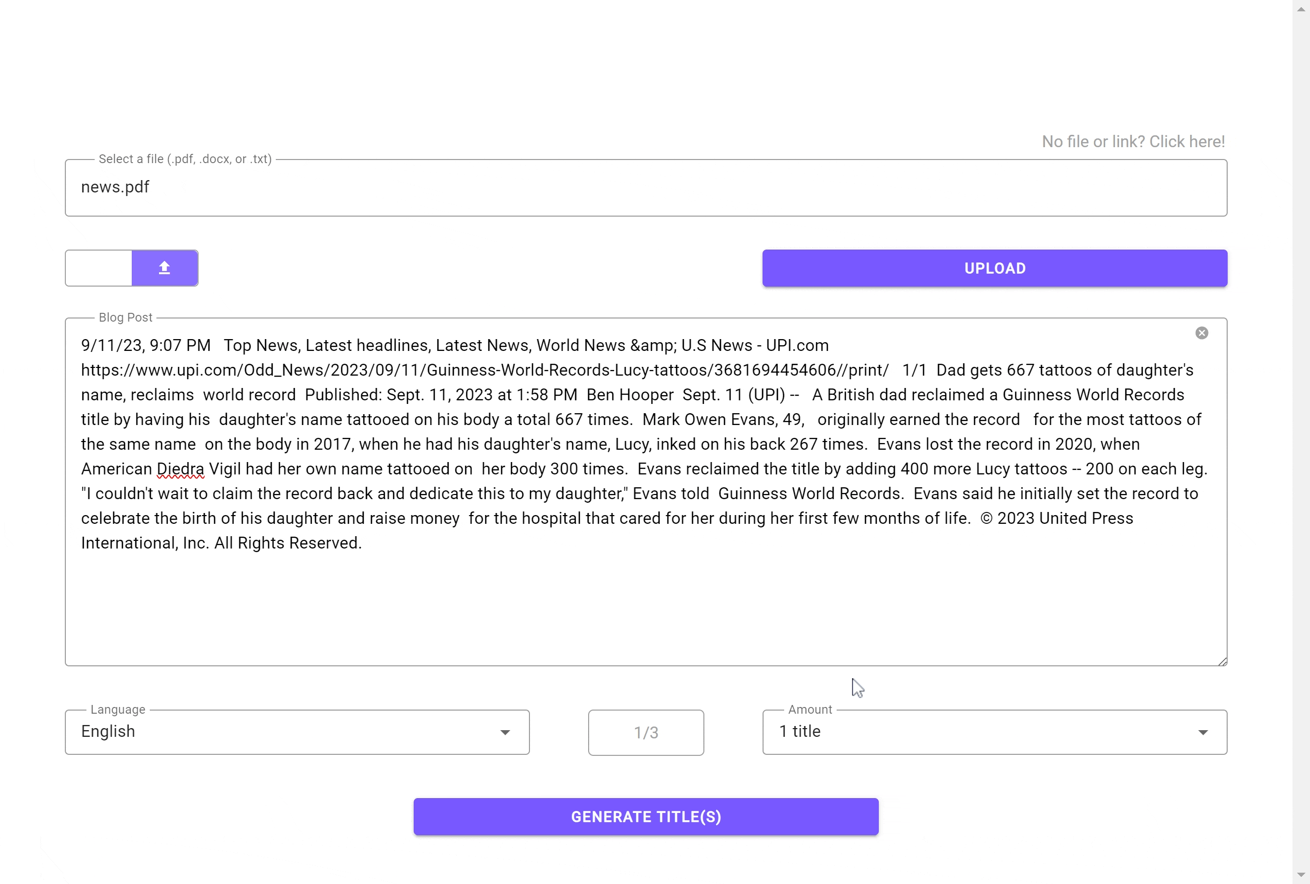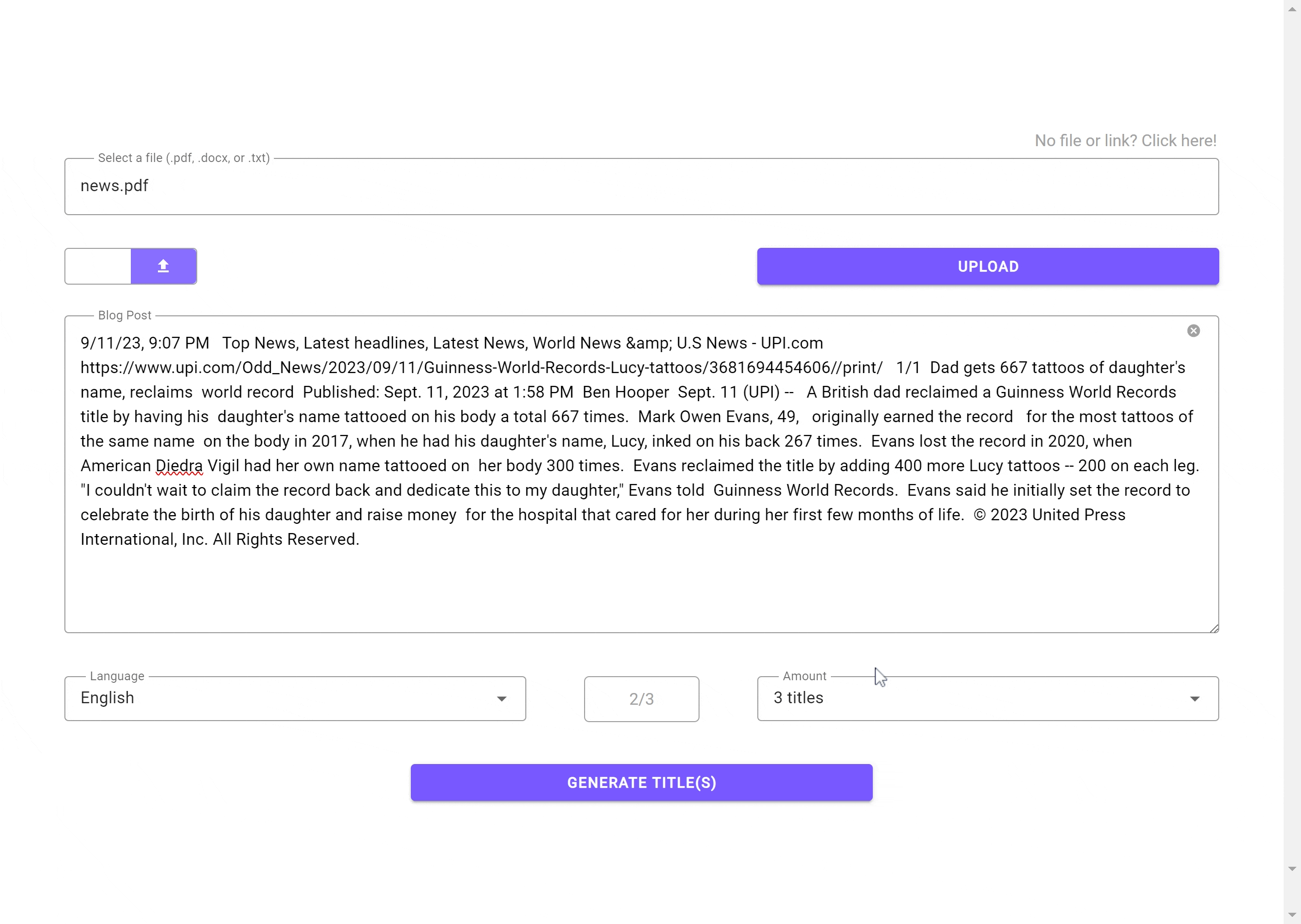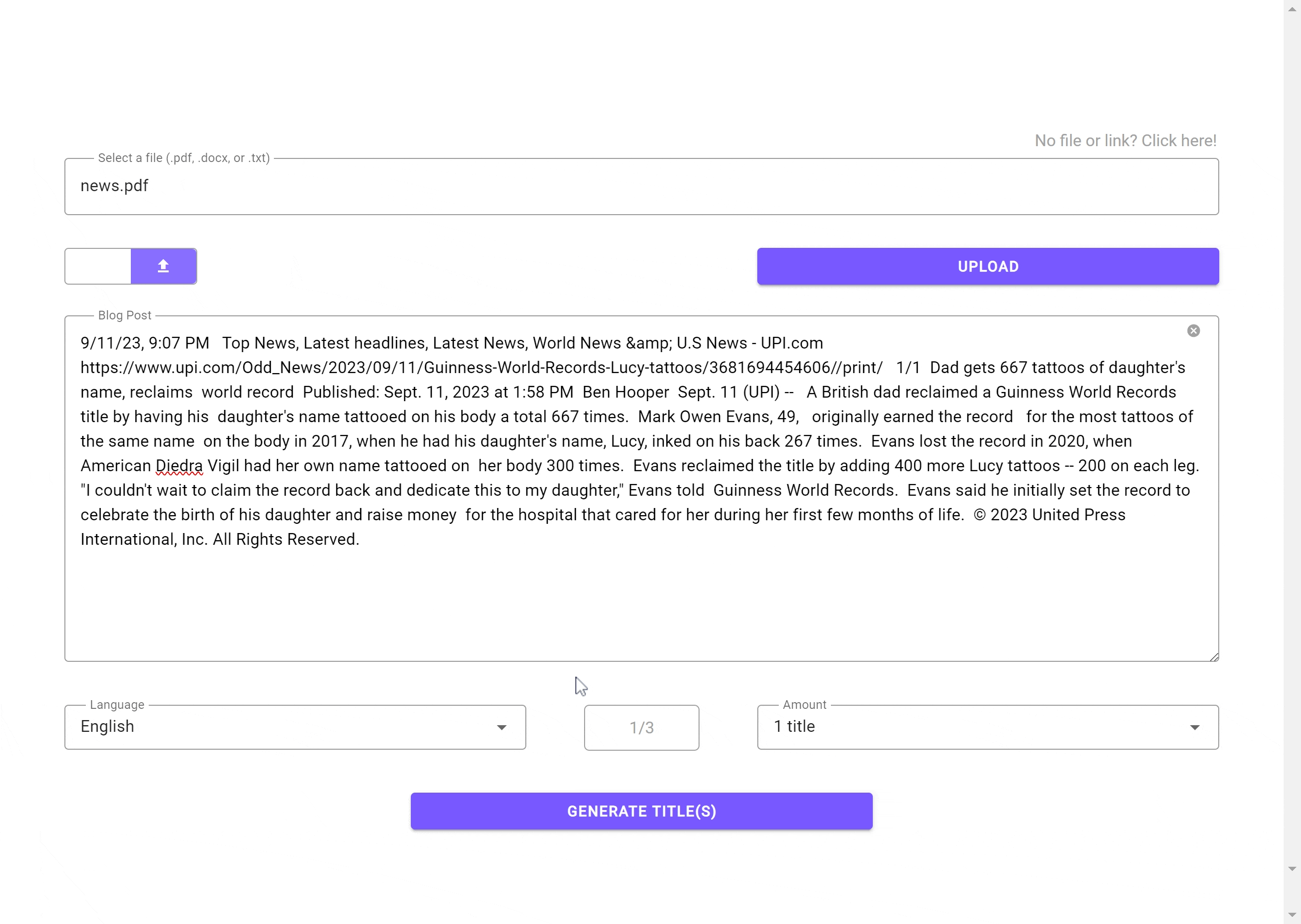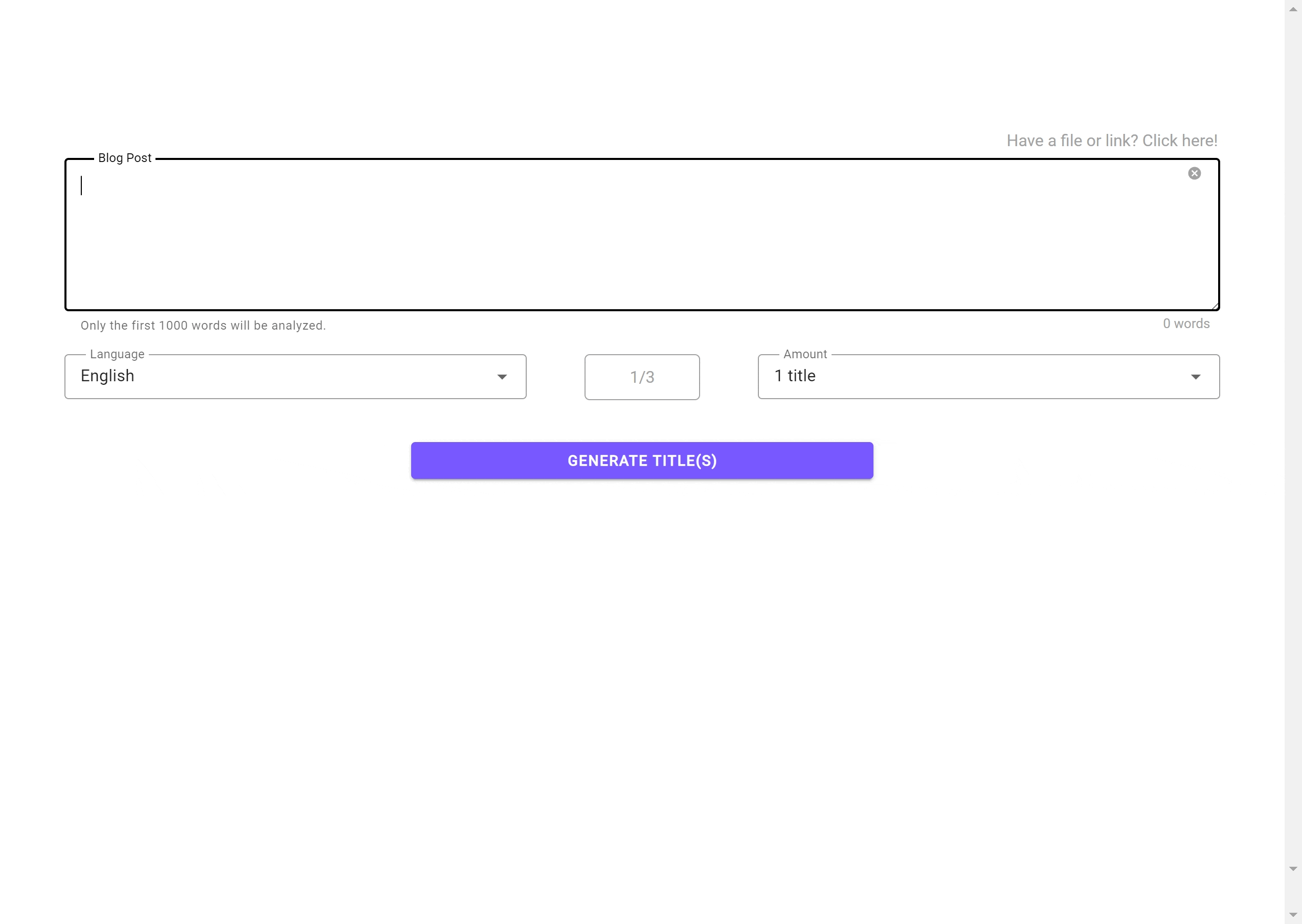 First, we begin by entering in your blog post in the main input field. If desired, you can upload a file (.pdf, .docx, or .txt file) or submit a website link to your blog post, and the text will be extracted and inserted into the input field. It is important to note that only the first 1000 words will be analyzed in the process of title generation. Our application includes a word count at the bottom right corner, so you will know when you reach the limit.