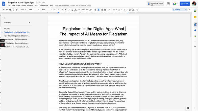 • Writers - Create your content in a Google Document and share the free Originality.ai chrome extension with your clients so that if there is any False Positive you can prove you created the document. Share how we recommend people use the AI detection score. AI detection is not the same as plagiarism checking and should have a more nuanced approach to what is and is not acceptable.