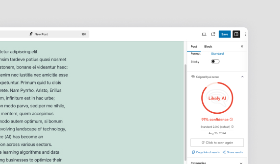 Effortlessly incorporate powerful AI detection software with 99%+ accuracy into your WordPress workflow.